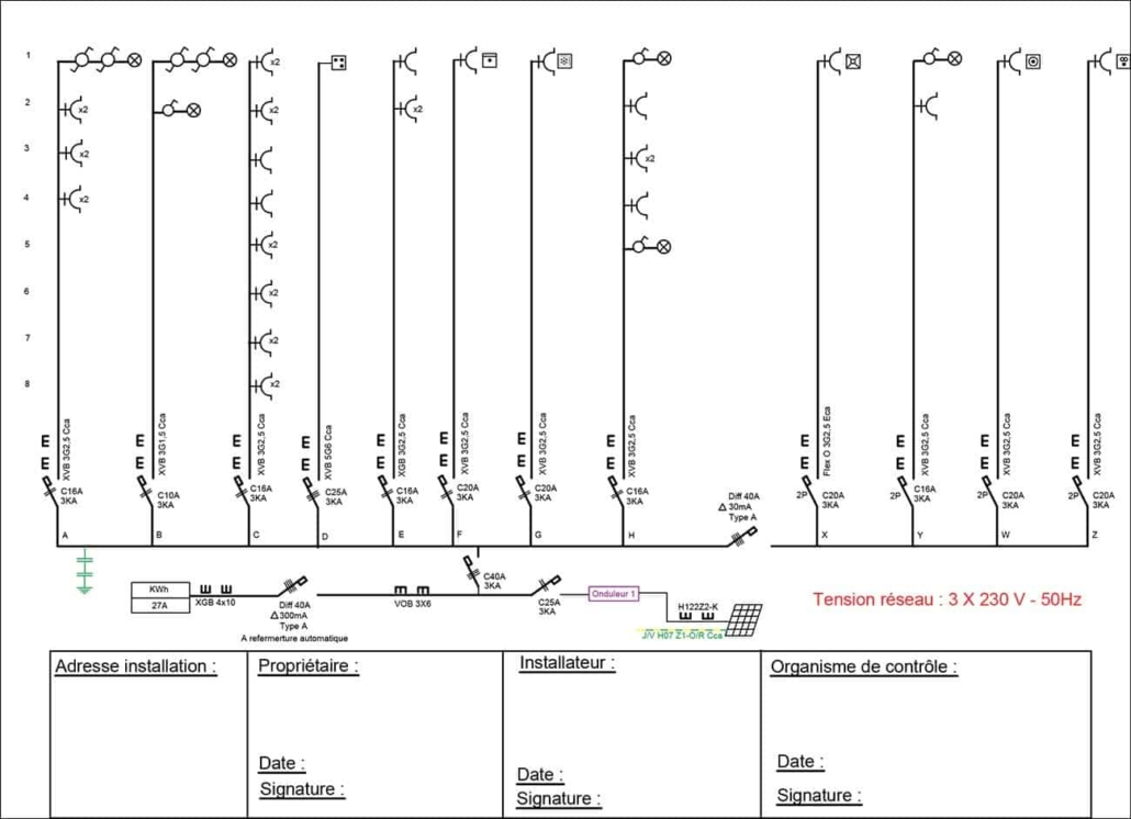 Le schéma unifilaire représente la structure logique de votre installation électrique : les circuits, leurs interconnexions et le matériel électrique qui compose l’installation.